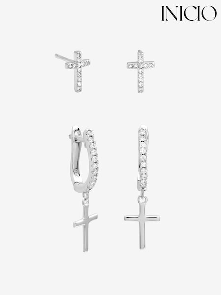 Inicio Sterling Silver Plated Cross Hoop and Stud Earrings Pack of 2