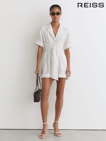 Reiss Ivory/Navy Estella Linen Pinstripe Belted Playsuit