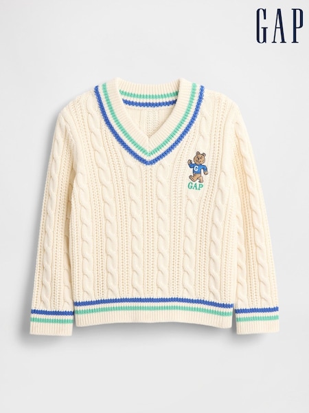 Gap Cream Brannan Bear Logo Varsity V-Neck Cable Knit Jumper (6mths-5yrs)