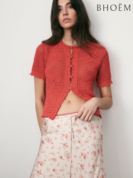 BHOEM Raspberry Pink Short Sleeve Crochet Cardigan