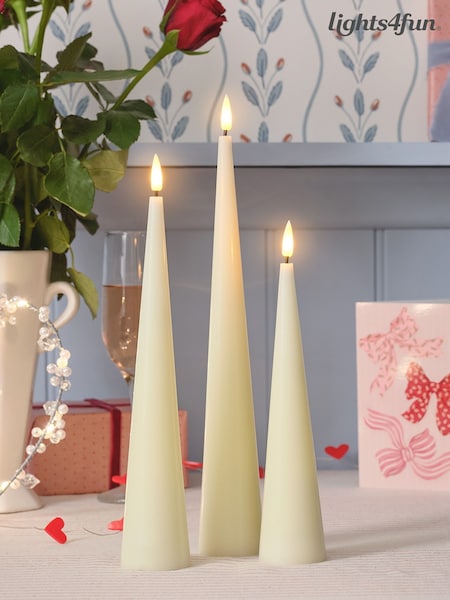 Lights4fun Set of 3 Ivory Slim Cone Candles with Infrared RC