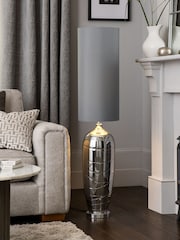 This contemporary floor light is designed with a smoke-plated glass base and a fabric shade. This floor lamp comes with a floor bracket to keep it stable. Height 131cm Diameter 28cm Click here for information on how to recycle your old electrical item. For Ireland: If this product contains an LED light bulb or luminaire, included in this price is a contribution to recycling costs of €0.05 60% Glass, 40% Textile. Bulbs not included, but we recommend a ES GLS 8W LED bulb 2 pack 804-435