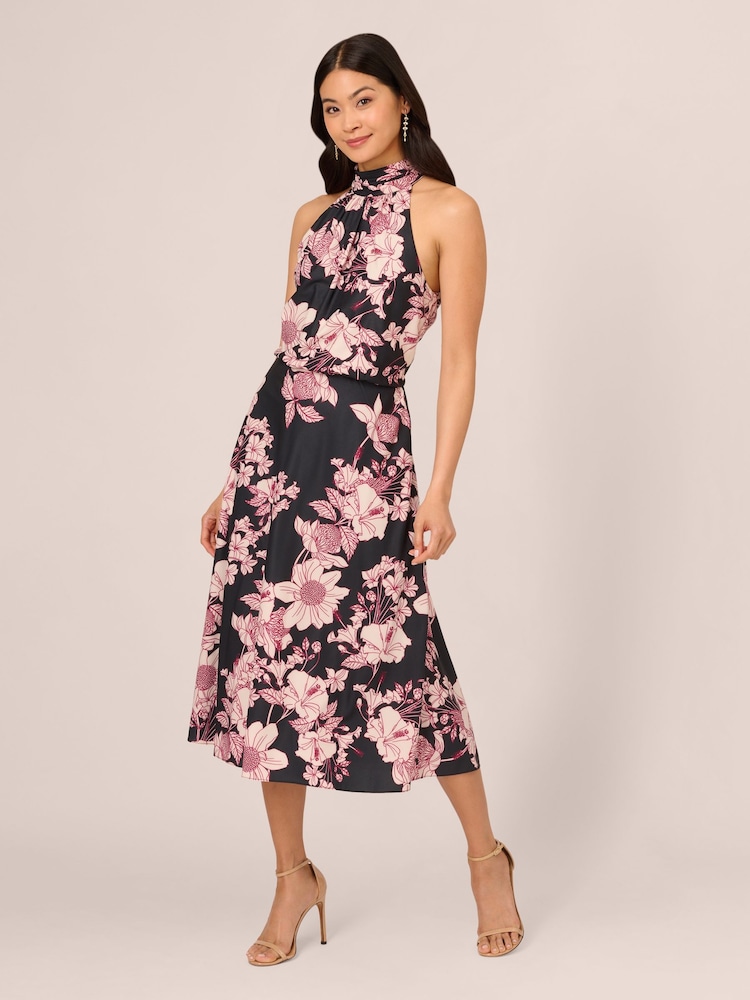 Adrianna Papell Print Chiffon Halter Black/Pink Dress